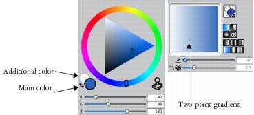 You can create very simple to very complex gradients. For a simple two-point gradient, you choose a main and an additional color, and then Corel Painter generates the gradient colors between them.