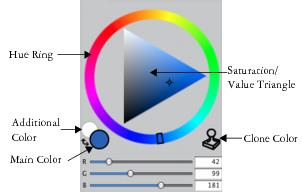 . The color swatches in Corel Painter operate differently than the Foreground and Background Color squares in Photoshop. To change the color, you can double-click either the Main Color swatch or the Additional Color swatch and then choose a new color on the Hue Ring. Or you can click in the Saturation/Value Triangle to choose a new tint or shade. You can use the additional color to create gradients or to use brushes that paint more than one color. Unlike the Background Color in Photoshop, the additional color does not affect the canvas.