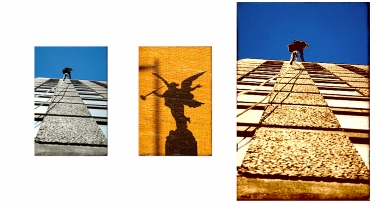 准备用于绘制的照片(左图)可使用的一种方法是选择包含要使用的颜色和色调的源图像(中图)。源图像的颜色和色调可应用于照片以创建底层图画(右图)。