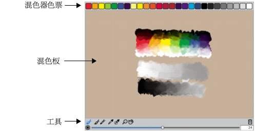 「混色器」面板可讓您模擬使用傳統畫家調色板混色的情形。在 [混色器] 面板中,您可以存取色票和各種可用於混色的工具。接著,您可以在 [混色器] 面板中央的 [混色板] 上套用兩種或更多色彩,然後將所有色彩混合調製成新的色彩。