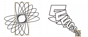 Beim Duplizieren der ovalen Form (links) wurde nur die Funktion Drehen verwendet. Beim Duplizieren der Form der Zahl 5 (rechts) wurden die Funktionen Bewegen, Skalieren und Drehen verwendet.