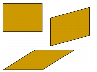Ein Rechteck (oben links) wird durch Ziehen eines mittleren Seitenbearbeitungspunkts (oben rechts) und des oberen mittleren Bearbeitungspunkts (unten) geneigt.