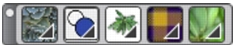 La barra Selettore materiali (visualizzata orizzontalmente). Da sinistra a destra: Selettore motivi, Selettore sfumature, Selettore immagini base, Selettore trame, Selettore pennello composito.