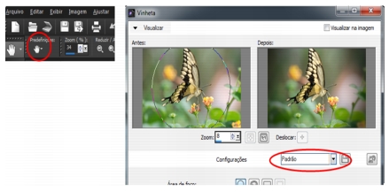 À esquerda, o botão da lista suspensa Predefinições, na paleta Opções de ferramentas da ferramenta Deslocar; à direita., o botão da lista suspensa Predefinições na caixa de diálogo Efeito de carvão.