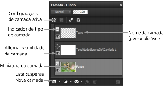 Se uma imagem tiver mais de uma camada, selecione a camada na qual deseja trabalhar. As alterações na imagem afetam apenas a camada selecionada (chamada também de camada ativa). Só é possível selecionar uma camada de cada vez.