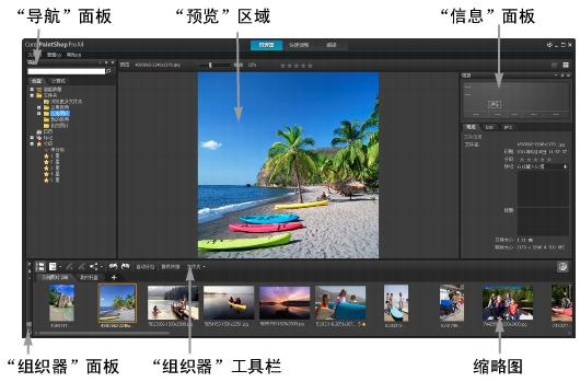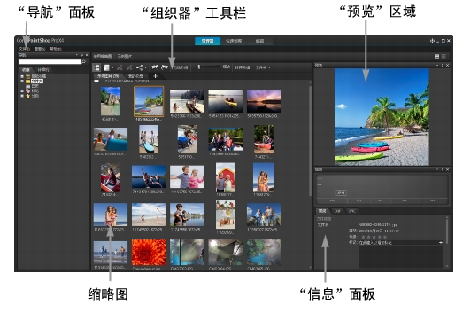 第一次启动 Corel PaintShop Pro 时,管理器工作区是主工作区,包含以下四个组件: “导航”面板、“预览”区域、“组织器”面板和“信息”面板。 有关这四个面板的信息,请参阅“管理器”工作区。