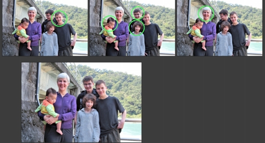 修复群景中有人眨眼或看向别处的情况 — 只需将其它照片中的姿势对换过来即可。 |