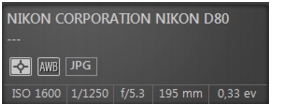 Am oberen Rand der Infopalette ist eine kameraartige Anzeige verfügbar, in der Sie die Kameraeinstellungen überprüfen können, die für das ausgewählte Foto verwendet wurden.