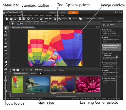 The Edit workspace lets you access in-depth editing features. It includes menus, tools, and palettes that you can use to create and edit images. In addition to photo editing, it lets you perform painting and drawing tasks.