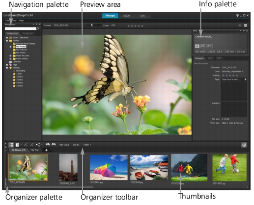 When you open Corel PaintShop Pro, the Manage workspace appears as your default workspace.