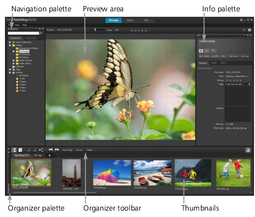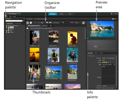 When you start up Corel PaintShop Pro for the first time, the Manage workspace appears as your main workspace with the following four components: Navigation palette, Preview area, Organizer palette, and the Info palette. For information about each of these palettes, see The Manage workspace.