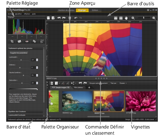 Lorsque vous ouvrez Corel PaintShop Pro, l’espace de travail Gestion de photos s’affiche en tant qu’espace de travail par défaut.