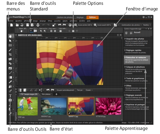 L’espace de travail Édition permet d’accéder à des fonctions de modification avancées. Il contient des menus, des outils et des palettes qui vous permettent de créer et de modifier des images. Outre la modification des photos, il vous permet également de réaliser des peintures et des dessins.
