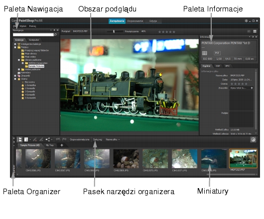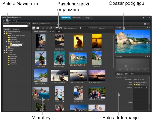 Przy pierwszym uruchomieniu programu Corel PaintShop Pro jako główny obszar roboczy jest wyświetlany obszar roboczy Zarządzanie, który składa się z czterech paneli: paleta Nawigacja, obszar podglądu, paleta Organizer i paleta Informacje. Informacje o każdej z tych palet można znaleźć w części Obszar roboczy Zarządzanie.