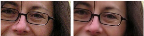 Изображение слева выглядит зернистым из-за шума цифровой камеры. На изображении справа переход между цветами более плавный, а зернистость после удаления шума уменьшилась.