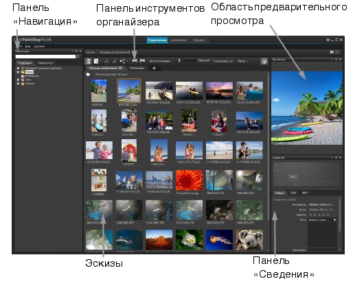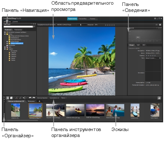 При первом запуске Corel PaintShop Pro отобразится экран Рабочее пространство управления со следующими четырьмя компонентами: панель навигации, область предварительного просмотра, панель органайзера и панель сведений. Для получения дополнительных сведений об этих панелях см. Рабочее пространство управления.