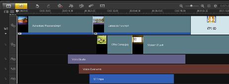 リップル編集では、クリップを挿入または削除するときに、そのクリップに合わせてタイムライン上の他のクリップ(空白スペースを含む)が自動的に移動します。リップル編集の開始位置は挿入ポイントの後です。このモードを使うと、別のクリップを挿入または削除する際に、トラックの元の同期状態を維持できます。
