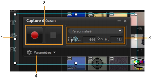 La fenêtre principale du programme Corel VideoStudio Pro est réduite en arrière-plan et la barre d'outils Capture d'écran s'affiche. |