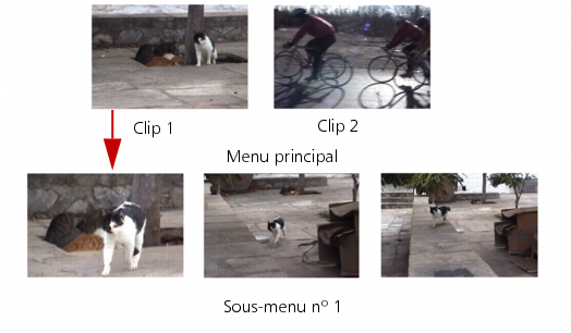 Dans cet exemple, le clip 1 compte trois chapitres. Par conséquent, lorsque vous cliquez sur la diapo vidéo clip 1, vous passez au sous-menu nº 1. Le clip 2, quant à lui, ne compte pas de chapitre : lorsque vous cliquez dessus, la lecture de la vidéo commence au début.