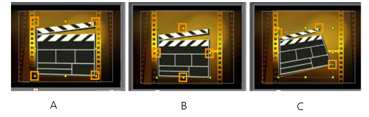 | • | Faites glisser les poignées vertes sur les coins pour incliner le clip (C). |