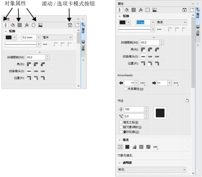 在本示例中,"属性"泊坞窗在选项卡模式(左)和滚动模式(右)中显示所选矩形的可编辑属性。
