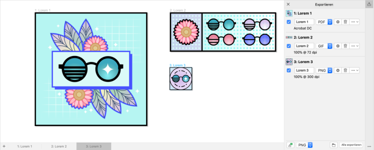 Mit wenigen Klicks können Sie Seiten oder Objekte in branchenübliche Formate (inklusive PDF) übertragen. Dasselbe Designelement kann gleichzeitig mit verschiedenen Einstellungen exportiert werden, indem Sie es im Informationsfenster Exportieren duplizieren und die Ausgabeoptionen ändern. Sie können auch mehrere Elemente gleichzeitig exportieren und für alle die gleichen Einstellungen verwenden. Weitere Informationen finden Sie unter Objekte und Seiten exportieren.