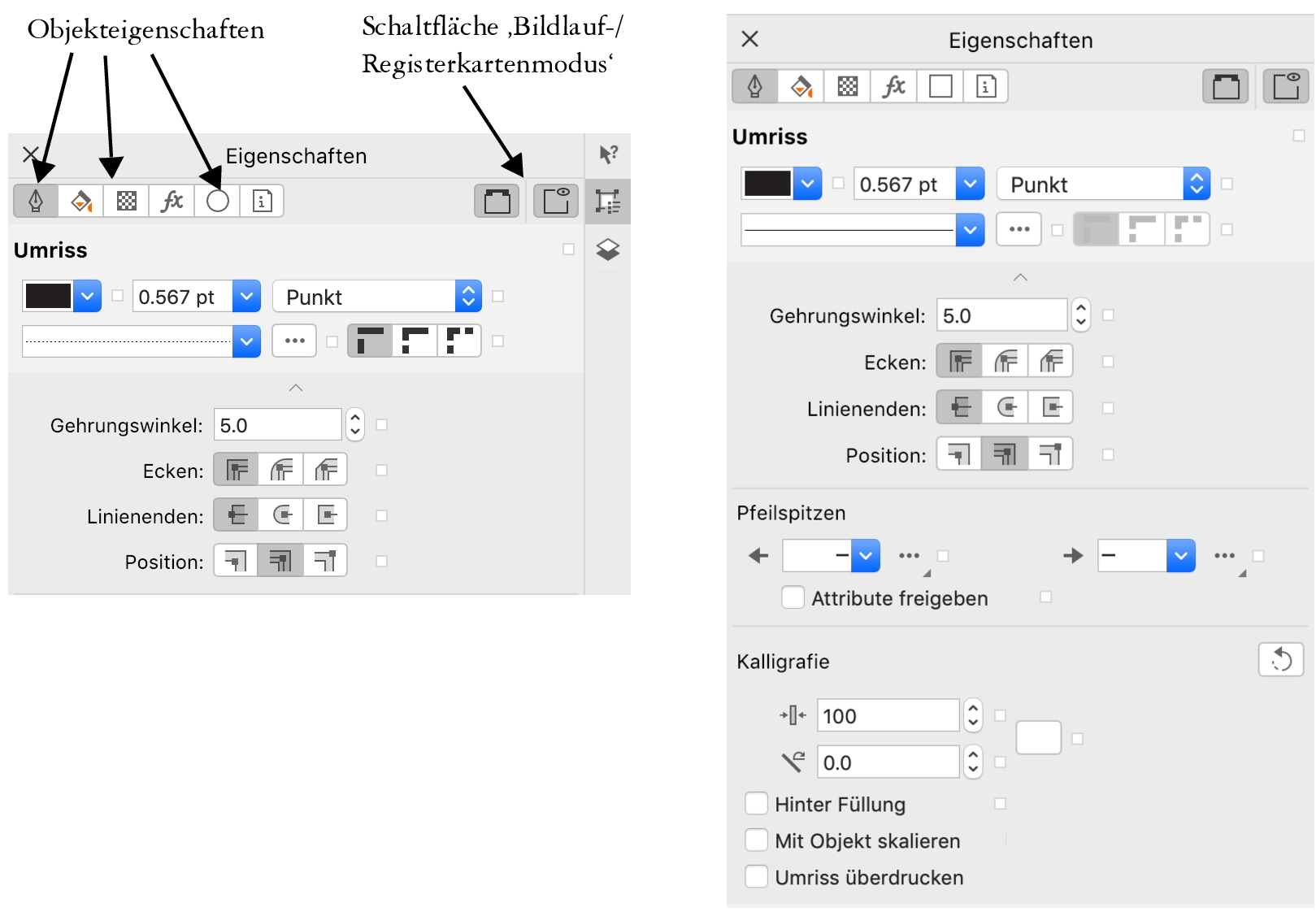 Mithilfe der Steuerelemente oben im Informationsfenster Eigenschaften können Sie schnell zu den Eigenschaften navigieren, die Sie bearbeiten möchten. Darüber hinaus stehen Ihnen zwei Ansichtsmodi zur Verfügung: der Bildlauf- und der Registerkartenmodus. Im Bildlaufmodus werden alle relevanten Objekteigenschaften angezeigt, und Sie können einen Bildlauf zu den gewünschten Optionen durchführen. Im Registerkartenmodus wird jeweils nur eine Gruppe von Objekteigenschaften angezeigt, alle übrigen Optionen werden dabei ausgeblendet. Beispielsweise können Sie nur die Füllungsoptionen anzeigen und dann auf die Schaltfläche Umriss klicken, um nur die Umrissoptionen anzuzeigen.