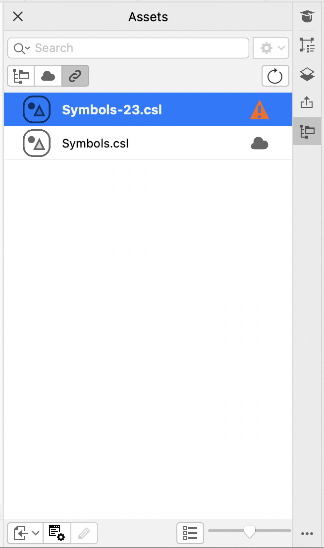 When you find the symbol library you need, you can link it to the document so that it is available for use. The Linked assets view in the Assets inspector lets you access the symbol libraries that are linked to the active document. If the symbol libraries are linked from the Cloud, you can refresh the file list to sync it with your Cloud folder.