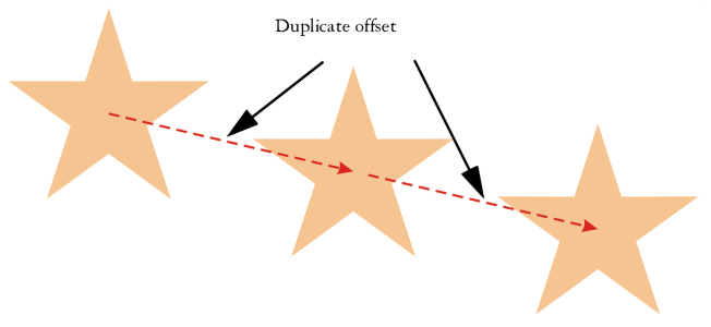 Si se duplica un objeto, se coloca una copia del mismo directamente en la ventana de dibujo y no se utiliza el Portapapeles. La duplicación de objetos es más rápida que la operación de cortar y pegar. Cuando se duplica un objeto, hay una distancia entre el objeto original y el duplicado a lo largo de los ejes X e Y. Esta distancia, conocida como descentrado de duplicado, se puede cambiar en el Preferencias.
