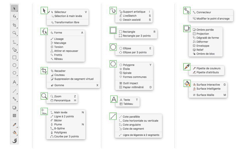 L’illustration ci-après présente les autres menus contextuels de la boîte à outils CorelDRAW par défaut et vous aidera à localiser plus facilement les différents outils.