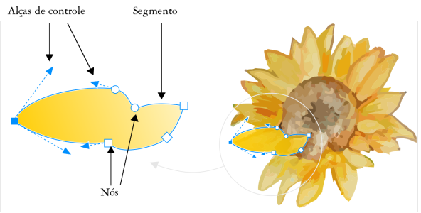 Um objeto de curva possui nós e alças de controle que podem ser usados para alterar a forma do objeto. Um objeto de curva pode ser de qualquer forma, inclusive uma linha reta ou curva. Os nós de um objeto são as pequenas formas exibidas ao longo do contorno do objeto. A linha entre dois nós é denominada segmento. Os segmentos podem ser curvos ou retos. Cada nó tem uma alça de controle para cada segmento de curva a ele conectado. As alças de controle ajudam a ajustar a curva de um segmento.
