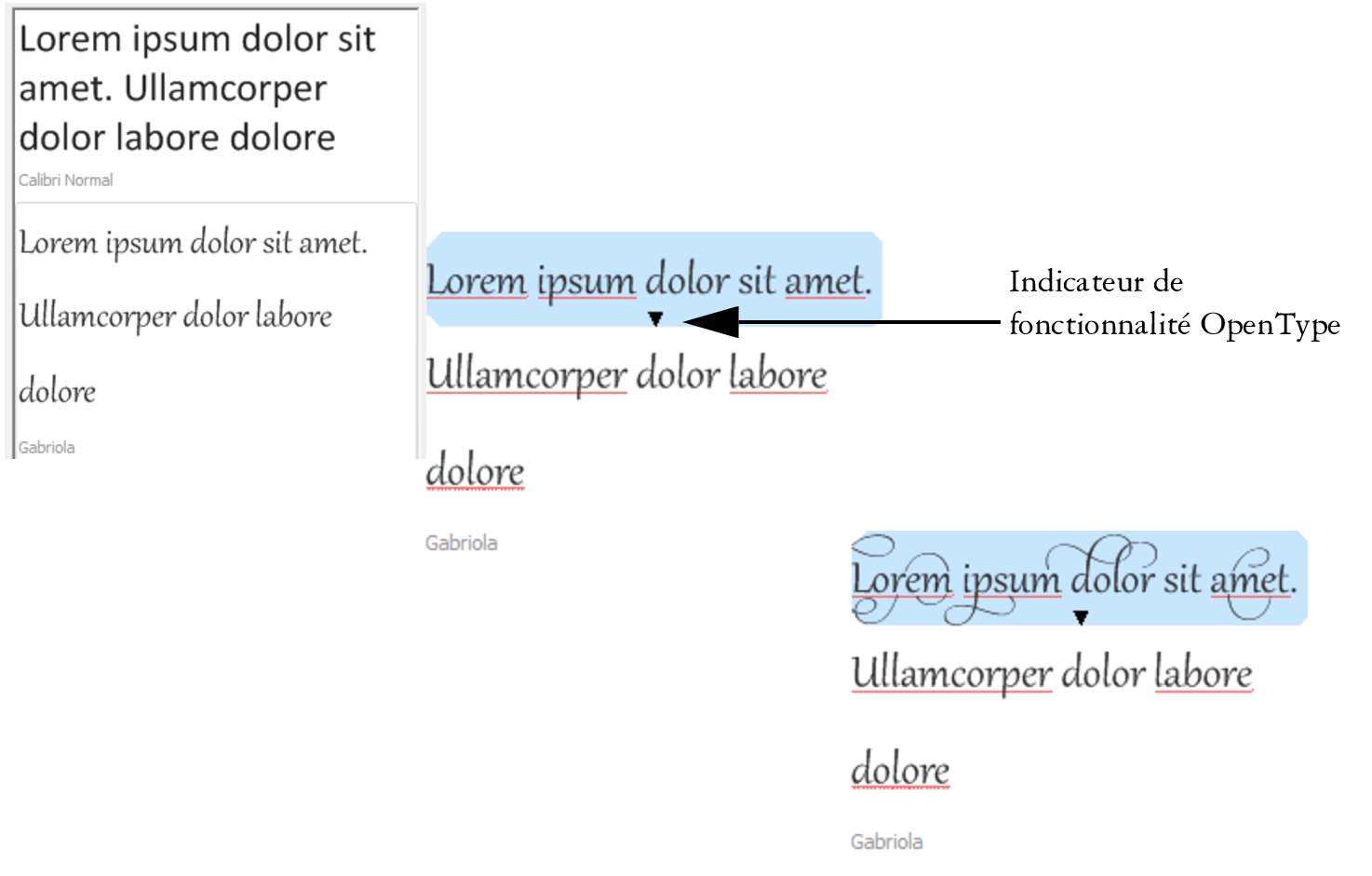 Lorsqu’un exemple de texte utilise une police OpenType, vous pouvez afficher les fonctionnalités OpenType et les appliquer à l’exemple de texte.