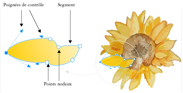 Les éléments d’une courbe : les poignées de contrôle, les segments et les points nodaux.