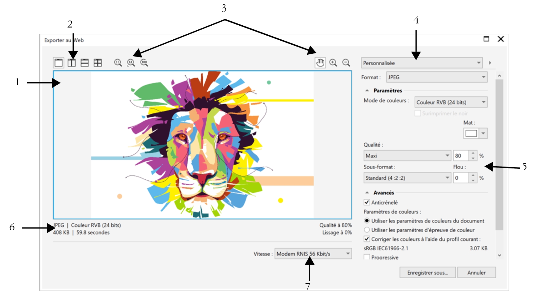 Pour spécifier des options d’exportation, vous pouvez prévisualiser une image dans quatre configurations différentes. Vous pouvez comparer les formats de fichiers, les paramètres prédéfinis, les vitesses de téléchargement, le taux de compression, la taille des fichiers, la qualité d’image et la gamme de couleurs. Pour étudier un aperçu, vous pouvez également utiliser les fonctions de zoom et de panoramique dans les fenêtres d’aperçu.