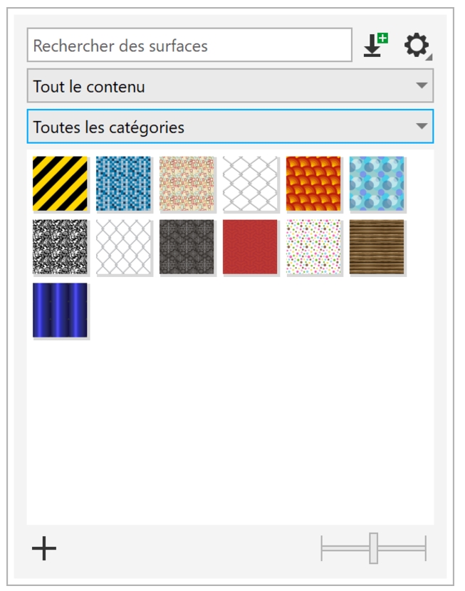 Pour vous aider à démarrer, Corel propose des surfaces locales répertoriées dans Tous les contenus dans les sélecteurs Surface et Transparence. Ces surfaces sont enregistrées dans votre dossier Documents\Corel\Contenu Corel\Surfaces. Si vous souhaitez élargir votre collection de surfaces, vous pouvez télécharger des packs de surfaces supplémentaires à partir de la boîte de dialogue Plus.