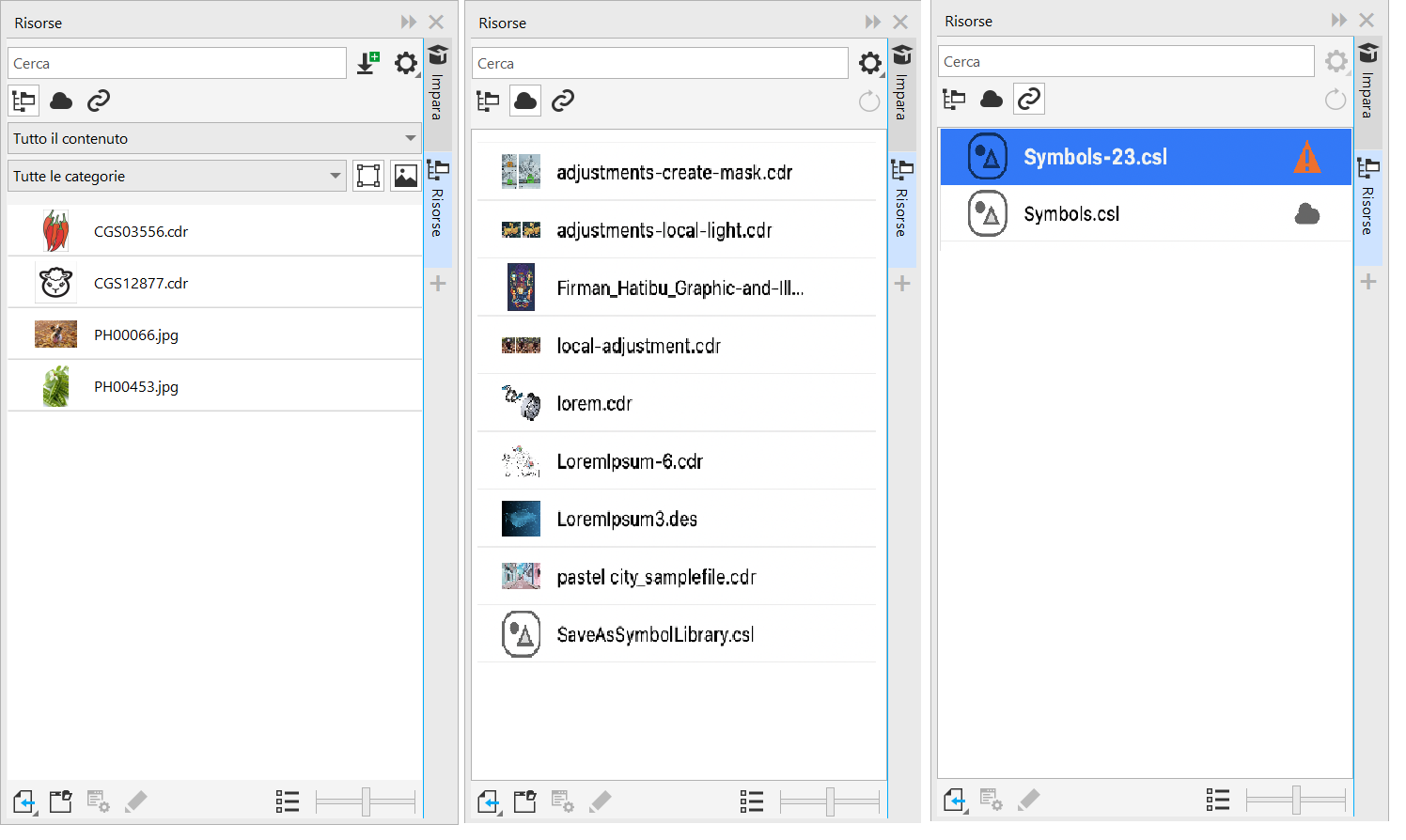 La finestra mobile Risorse fornisce tre visualizzazioni che agevolano l'utilizzo dei contenuti. La visualizzazione Risorse locali e di rete mostra le immagini vettoriali e bitmap, oltre alle altre risorse memorizzate nelle cartelle locali o di rete. La visualizzazione Risorse cloud mostra i file nella cartella Cloud, inclusi i file della libreria di simboli condivisi con l'utente. La visualizzazione Risorse collegate mostra le librerie di simboli collegate al documento attivo.