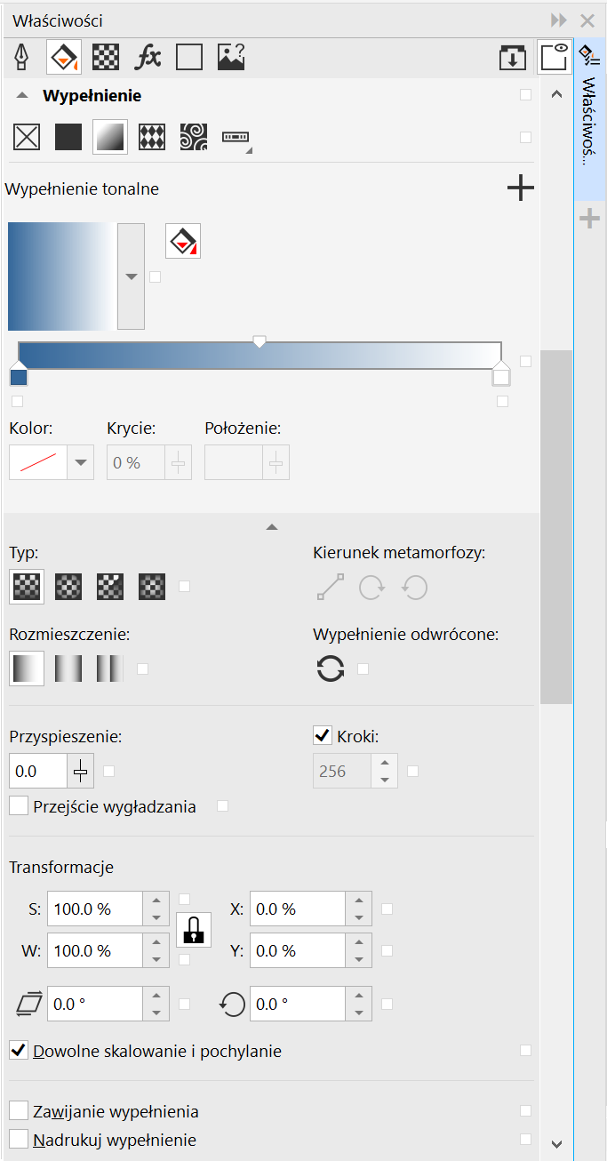 Właściwości wypełnień można edytować przy użyciu okna dokowanego Właściwości.