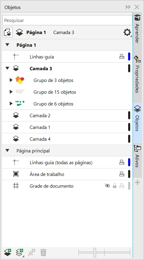 O nome da camada ativa e o tipo do objeto atualmente selecionado aparecem na barra de status na parte inferior da janela do aplicativo. Os nomes da página e da camada ativa também são exibidos na parte superior da janela de encaixe Objetos.