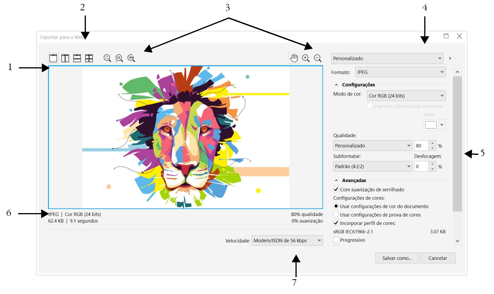 Ao especificar opções de exportação, é possível visualizar uma imagem com até quatro configurações diferentes. É possível comparar formatos de arquivo, configurações predefinidas, velocidades de download, compactação, tamanho do arquivo, qualidade de imagem e faixa de cores. Além disso, você pode examinar as visualizações aplicando zoom e panning dentro das janelas de visualização.