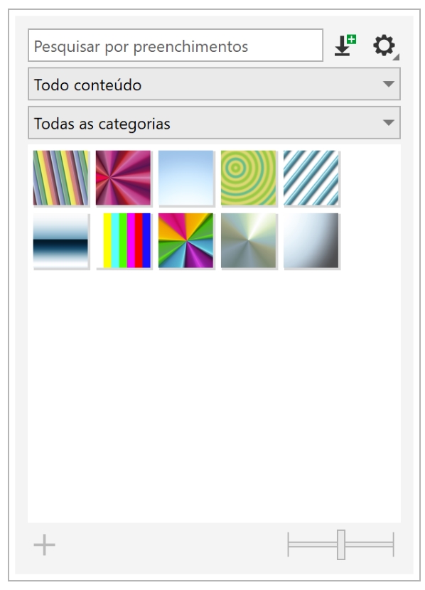 Para começar, o Corel fornece preenchimentos locais que estão listados em Todo o conteúdo nos seletores Preenchimento e Transparência. Estes preenchimentos são armazenados na sua pasta Documentos\Corel\Corel Content\Fills. Se você quiser ampliar sua coleção de preenchimento, pode fazer download de pacotes de preenchimento adicionais a partir da caixa de diálogo Obter mais.