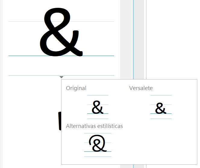 Cada caractere selecionado aparece com relação a um conjunto de linhas azuis que permitem visualizar sua posição em relação à linha de base do texto.