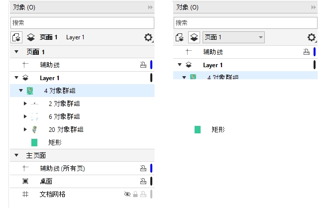 活动图层的名称以及当前选择的对象的类型显示在应用程序窗口底部的状态栏中。活动页面和图层的名称还将显示在对象泊坞窗的顶部。