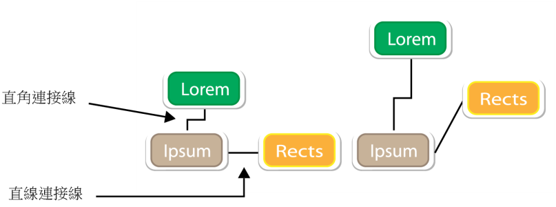 您可以繪製三種連接線;可以繪製直線連接線,也可以繪製具有尖角或圓角的直角連接線。透過移動、新增或刪除線段可以編輯連接線。