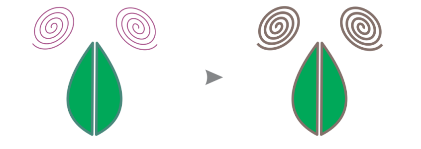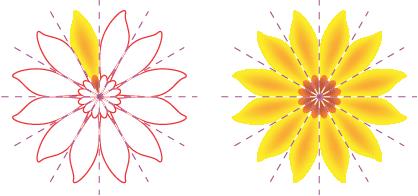 ,在對稱群組中修改物件。當您使用「形狀」工具重新造型主要物件時,會以預設的主色彩來顯示向量預覽,而物件複本外框則顯示為預設的次要色彩。如需更多關於這些預覽色彩以及如何變更色彩的資訊,請參閱節點、控點和預覽選項.
