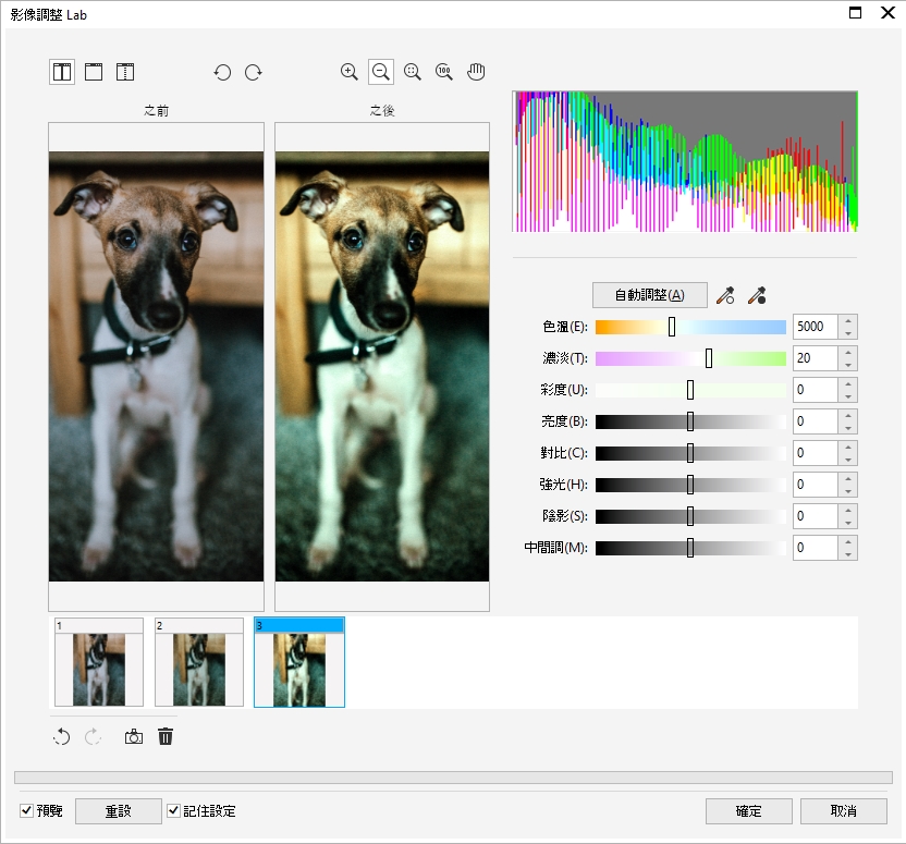 「影像調整 Lab」可讓您快速且輕鬆地校正大部分相片的色彩和色調。