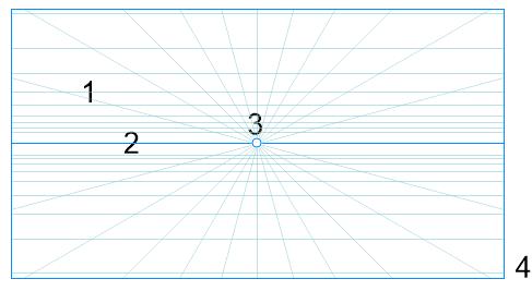 Die Elemente eines Perspektivenbereichs: Perspektivenraster (1), Horizont (2), Fluchtpunkt (3), Ansichtsbereich (4)