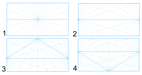 Perspektiventypen: (1) Einpunktperspektive, (2) Zweipunktperspektive, (3) Dreipunktperspektive (Froschperspektive), (4) Dreipunktperspektive (Vogelperspektive)