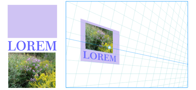 Ein Rechteck, ein Textobjekt und eine Bitmap (links) wurden auf die rechte Ebene verschoben (rechts) und sind nun Teil der perspektivischen Gruppe.