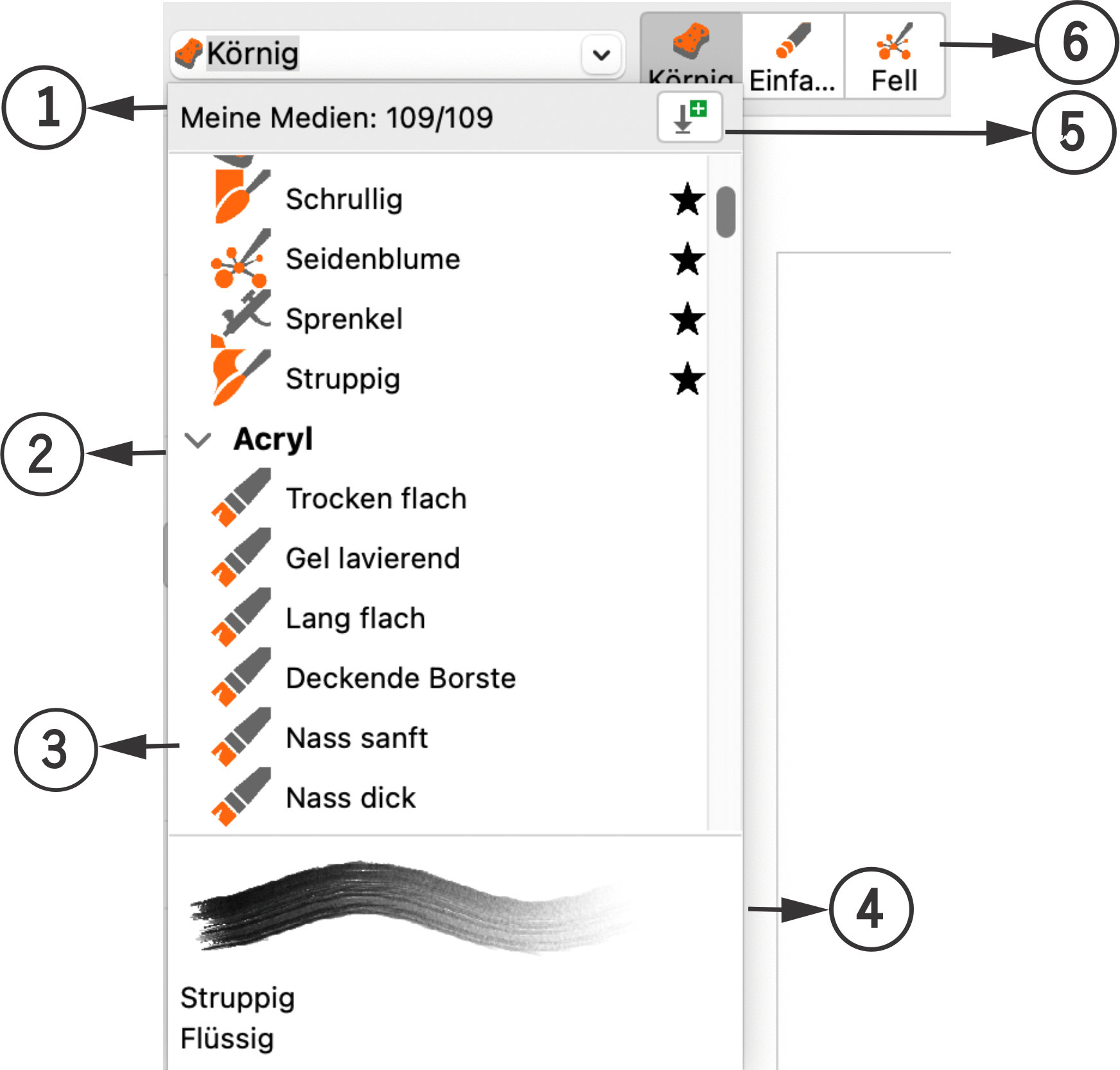 durchsuchen und auswählen. Das Bild unten zeigt die Hauptkomponenten der Pinselauswahl.