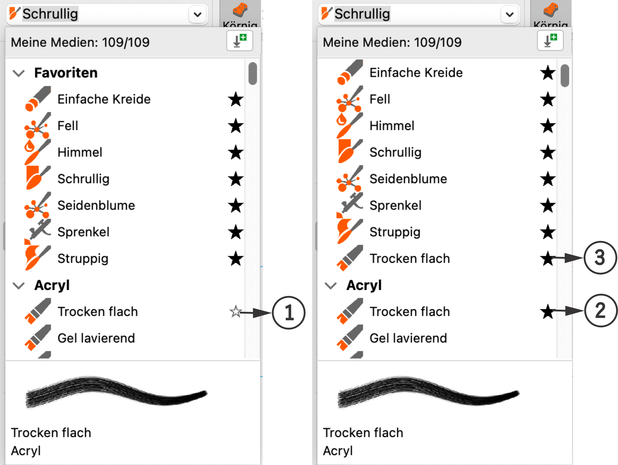 Der ausgewählte Pinsel (1) wird als Favorit (2) gekennzeichnet und der Kategorie Favoriten hinzugefügt (3).